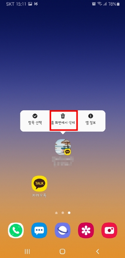 2. 메뉴가 뜨면 '홈 화면에서 삭제'를 터치하면 아이콘이 삭제됩니다.