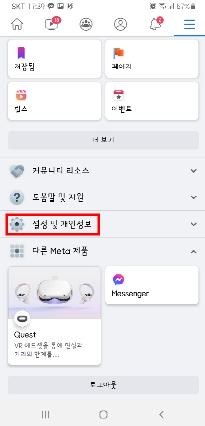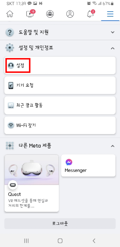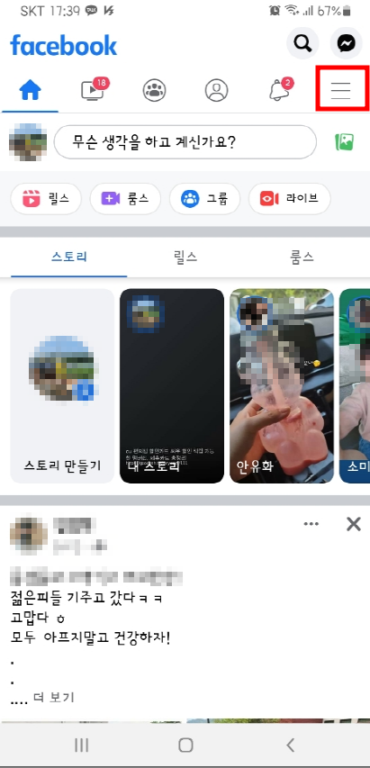 1. 페이스북 앱에 들어가서 우측 상단의 세줄을 누릅니다.