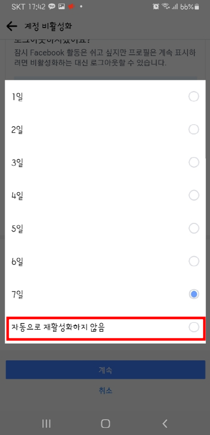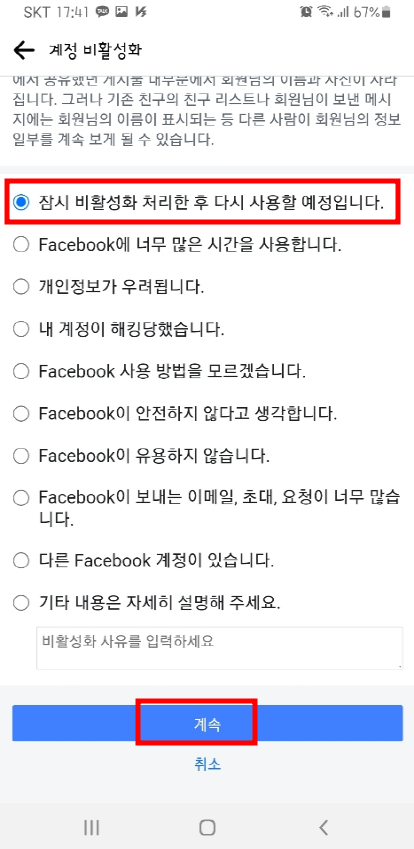 7. 다음 사유 선택 화면이 나오면 '잠시 비활성화 처리한 후 다시 사용할 예정입니다.'를