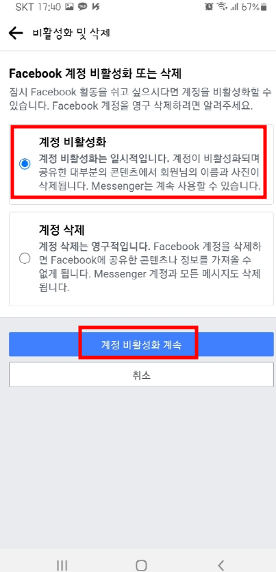 6. '계정 비활성화' 선택 후 '계정 비활성화 계속'을 누릅니다.