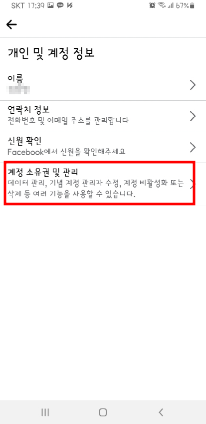 4. 다음 '개인 및 계정 정보'를 누른 후 '계정 소유권 및 관리'를 누릅니다.